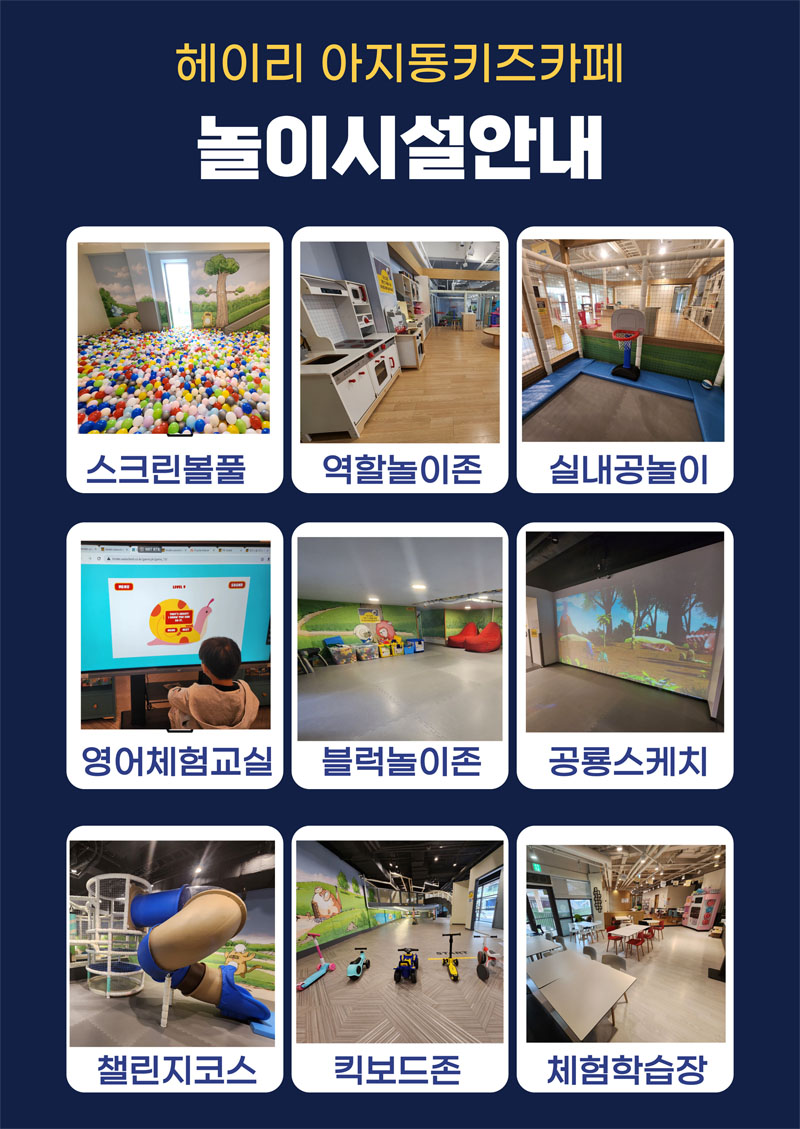 * 아지동 키즈카페는 영업시간 내 종일제로 운영되고 있으며 재입장 및 외부음식 반입은 제한하고 있습니다. (키즈카페 내 식음료장에서 식사 메뉴와 음료 매뉴를 판매하고 있습니다.)